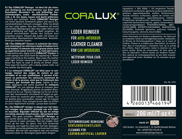 Prije uporabe dobro protresite bočicu. Nanesite malu količinu sredstva za čišćenje CORALUX® na meku spužvu i stisnite da se stvori pjena. Nikada ne nanosite izravno na kožu. Sada nježno kružnim pokretima pomičite spužvu po koži kako biste uklonili prljavštinu. Povremeno isperite spužvu mlakom vodom. Kod jače zaprljanosti omotajte meku krpu bez dlačica oko četke, nanesite malu količinu sredstva za čišćenje CORALUX® na krpu i nježno trljajte kožu. Za kožu s grubom, dubokom teksturom/reljefom najbolje je koristiti samo meku četku kako biste bolje dosegli prljavštinu u udubljenjima. Nanesite malu količinu sredstva za čišćenje CORALUX® na četku i nježno trljajte kožu. Ostavite pjenu da kratko djeluje na jako zaprljanim područjima. Nakon čišćenja, lagano obrišite kožu vlažnom pamučnom krpom. Koristite destiliranu vodu kako biste izbjegli mrlje od kamenca. Ostavite da se temeljito osuši.