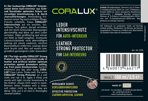 Ne radite ovo kasnije od jednog dana nakon tretmana njege. Prije upotrebe dobro protresite bočicu. Nanesite malu količinu CORALUX® Intensive Protectora na meku krpu koja ne ostavlja dlačice, utrljajte ga i ravnomjerno i vrlo tanko rasporedite po navlaci sjedala nježnim kružnim pokretima. Radite na velikoj površini, uvijek od šava do šava. Nikada ne nanosite CORALUX® Intensive Protector izravno na navlaku sjedala. Višak proizvoda uklonite čistom, mekom pamučnom krpom dok je još vlažna. CORALUX® Intensive Protector je isključivo zaštitni proizvod, a ne proizvod za njegu. Koristite samo na novim ili temeljito očišćenim presvlakama za sjedala. Losion može uzrokovati blagi sjaj kože, stoga ga nanesite vrlo tanko i ravnomjerno.