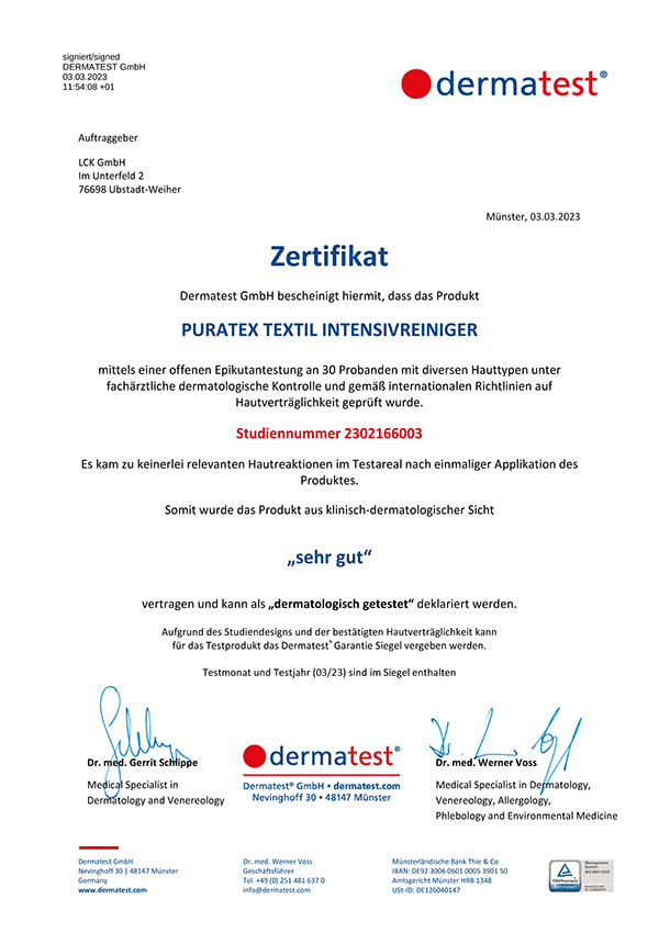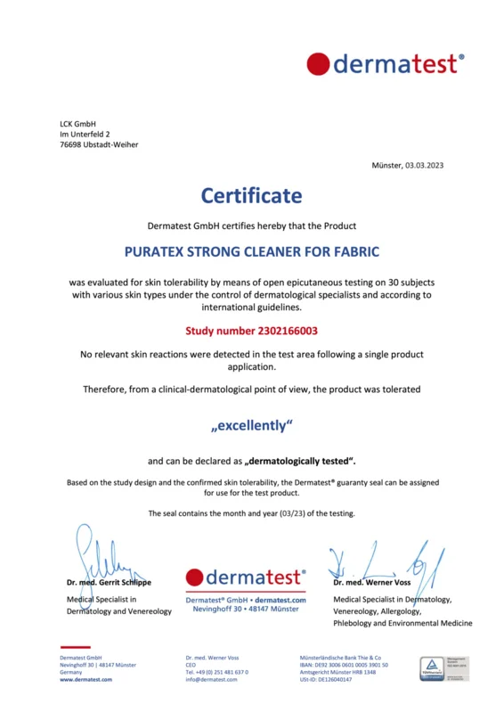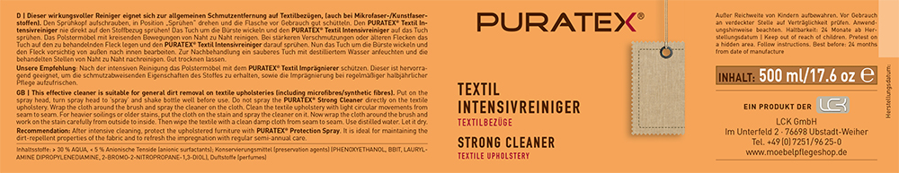 Zahvaljujući pažljivo razvijenoj formuli, PURATEX® intenzivno sredstvo za čišćenje tekstila prodire duboko u vlakna i otpušta nečistoće, masnoće i svakodnevne tragove korištenja, dok pritom zadržava prirodan izgled i mekoću tkanine. Sredstvo je prikladno za gotovo sve tekstilne presvlake, uključujući tkanine od prirodnih vlakana, sintetičke materijale i mikrovlakna, kao i za vunu. Iznimka je svila, za koju se ovaj proizvod ne preporučuje.