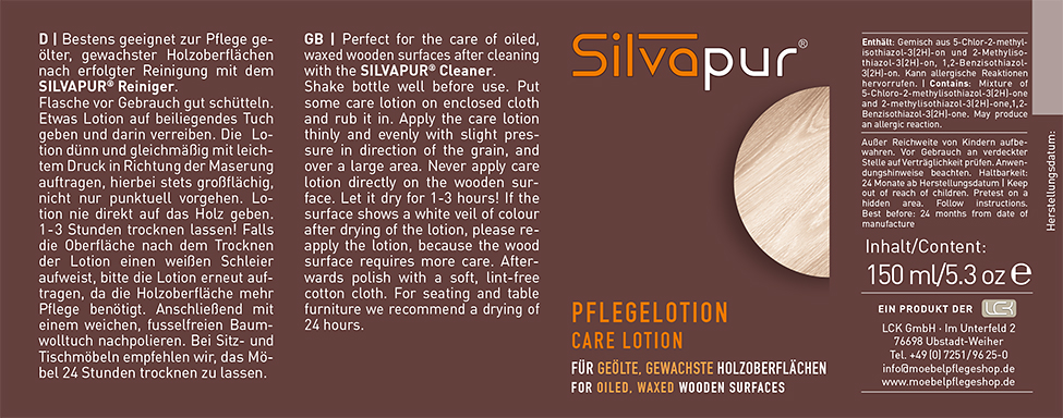 Ulijte malo losiona na priloženu krpu i utrljajte. Nanesite tanki, ravnomjerni sloj losiona u smjeru godova, lagano pritiskajući, uvijek pokrivajući veliku površinu. Nikada ne nanosite losion izravno na drvo. Ostavite da se suši 1-3 sata! Ako površina ima bijeli film nakon što se losion osušio, ponovno nanesite losion, jer drvena površina zahtijeva više njege. Zatim polirajte mekom pamučnom krpom koja ne ostavlja dlačice. Za namještaj za sjedenje i stolove preporučujemo da se namještaj suši 24 sata.